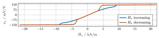 Characteristic curve of a TMR sensor for an increase in field strength (blue) and a subsequent decrease (red). An automated setup for characterizing the angle sensors was presented in [22].
