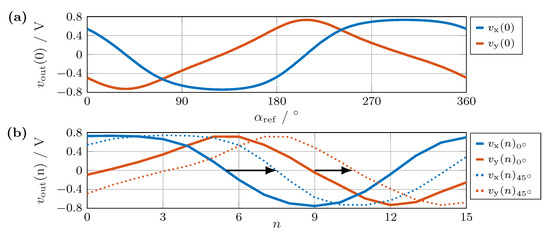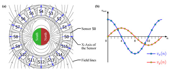 In the circular array configuration, the sensors are arranged at a stepwise rotating angle, resulting in a cosine wave when the output signals of all sensors are plotted over their index n in the array, as shown in Figure 3b. The same applies to the sine shape of the output signal . With the radial magnetization and magnet position, the maximum occurs at sensor S0, and the minimum is at S8. For the voltage , these occur at sensors S4 and S12, respectively. With the rotation of the magnet, these sensor indexes change accordingly. However, the two voltage curves have different amplitudes. The difference can be explained with the magnetic dipole equation [26], considering only the component, which represents the field strength along the x-axis.