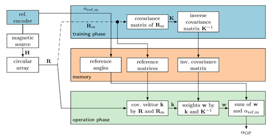A machine learning method was used for training, with Gaussian process (GP) regression proving to be a well-suited approach. The procedure is outlined in [31] for a squared sensor array for angular measurement. We adapted this method for the circular sensor array. In general, the GP regression consists of two phases, as overviewed in Figure 5.