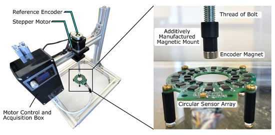 We examined the signal processing methods and the resulting angular errors on the test bench shown in Figure 6. The measurement data from the circular sensor array were recorded with the microcontroller system and evaluated on a PC. A capacitive reference encoder on the test bench provided the angular information to determine the angular accuracy of the magnetic measurement. The encoder had an absolute angular resolution of 14 bits, resulting in an accuracy of around 0.02° [33]. Considering the potential application of the torsion measurement in screws, an M8 × 160 bolt was employed as the shaft. At the end of the bolt, an attachment on the thread held a diametrically magnetized cylindrical magnet of grade N45. This magnet had a diameter of 10 mm and a width of 8 mm. A stepper motor rotated the shaft at a constant speed of 8 during the entire measuring process.