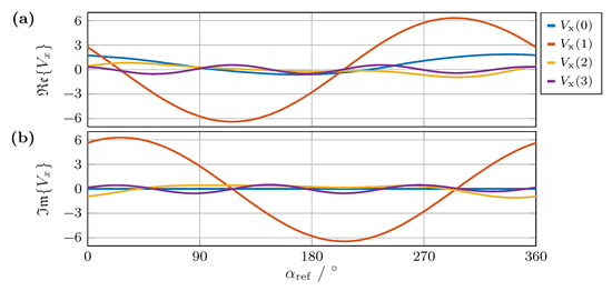 (a) Real and (b) imaginary parts of the first four frequencies of the Fourier transform of over a complete rotation of the encoder as a function of the reference angle.