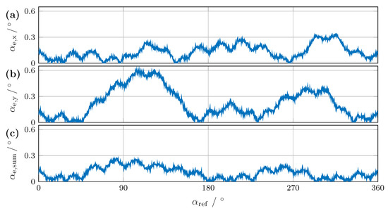 Table 1 shows the evaluation of the angular error with its maximum , mean , and standard deviation for different numbers of references over a full rotation. With an increasing number of references, only slight improvements occur, and the length scaling l decreases. As this is an angle evaluation, small deviations in the input signals for the angle calculation had a significant impact on the output signal.