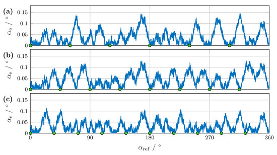 Next, we evaluated the angular error based on the calculation using GP regression. Figure 10 shows the angular error for six, eight, and ten reference positions. With just six reference positions in Figure 10a, the angular error was reduced to less than 0.15° over a full rotation. When further reference values were added, the peaks between the reference points were reduced, resulting in an error of less than 0.12°, as shown in Figure 10c.