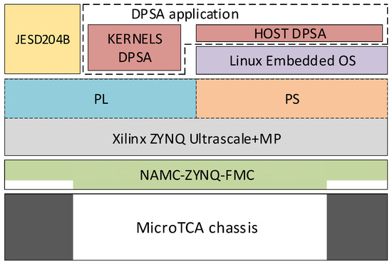 The system is based on a Micro Telecommunications Computing Architecture (MicroTCA) chassis [8,9,10], which provides physical, mechanical, electrical, and thermal support for a NAMC-ZYNQ-FMC Advanced Mezzanine Card (AMC) [11]. The NAMC-ZYNQ-FMC is a system-on-a-chip (SoC)-based AMC whose main component is a Xilinx ZYNQ Ultrascale + MP SoC [12]. The JESD204B standard [13,14] is implemented in the SoC programmable logic (PL) area to interface the digitizer and the DPSA application. This standard defines a serial interface that connects high-speed converters to logic devices such as FPGAs and Application Specific Integrated Circuits (ASIC). The JESD204B standard is implemented to connect the ADC directly to the processing hardware. Analog Devices provides an open-source intellectual property (IP) framework distributed under the GPL2 license to implement the JESD204 interface and the software to configure all the hardware elements [15]. Figure 1 displays the stack of the hardware and software elements mentioned earlier. The bottom two layers of the stack show the MicroTCA chassis that supports the NAMC-ZYNQ-FMC board. The third layer from the bottom features the Xilinx ZYNQ Ultrascale + MP SoC, which integrates a high-performance ARM-based multicore multiprocessing system (PS) with ASIC-class PL.