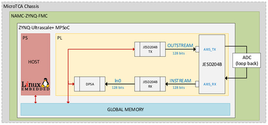 DPSA implementation scheme. The PL implements the DPSA using the streaming data read with the JESD204B interface. An external loopback connects the signal generation with the data acquisition.