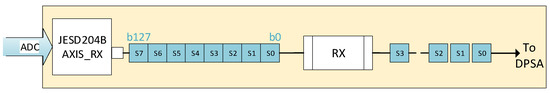 Since the ADC acquisition sampling rate and resolution are preset parameters, the JESD204B is designed to be coupled according to the FPGA resources. The JESD204B clock frequency is set to 125 MHz with a 128-bit data frame. In this scenario, 8 samples are acquired per system clock cycle, with each sample having a resolution of 14 bits (2 bytes wide). Therefore, 16 bytes are sent in a clock cycle. Figure 4 shows the data stream that couples the difference between the data acquisition and processing clocks.