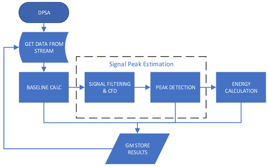 The DPSA kernel is implemented on the application layer of the JESD204B to achieve its objectives. Figure 5 shows the flowchart of the DPSA kernel, which operates using the pipeline technique. The kernel’s functions obtain the data buffer for the stream, calculate the baseline, filter the signal, detect the peak, and calculate the energy (see Supplementary Materials Section).