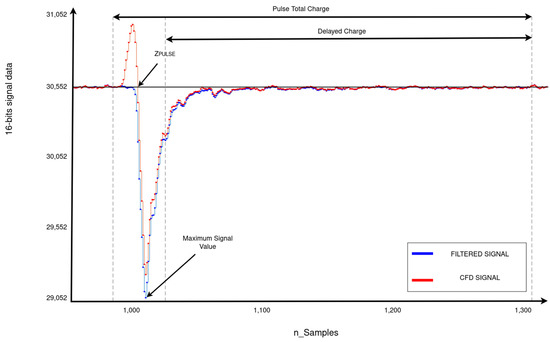 Close-up of the peak of the function output signals. The blue signal represents the filtered signal, while the red signal represents the CFD signal. The point where the pulse occurs is marked as ZPULSE, the total range to be integrated is marked as Pulse Total Charge, and the remaining range of the pulse is marked as Delayed Charge.