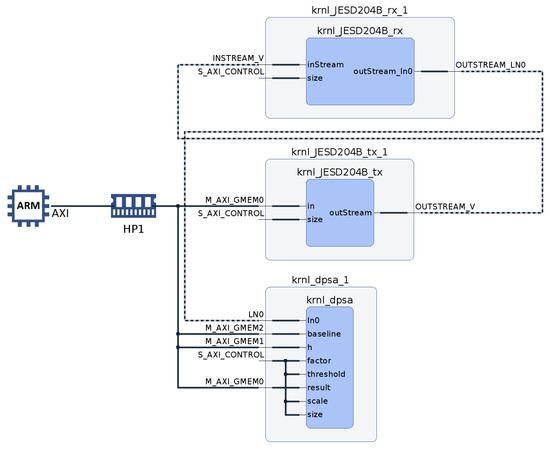 This work presents a DPSA system that can achieve high performance by directly interfacing with a 1 GS/s ADC through its JESD204B interface. Figure 8, which is extracted from the Vitis Analyzer system diagram, provides a visual representation of the interconnection of kernels utilizing the Advanced eXtensible Interface (AXI). The kernels are connected through AXI streams, as shown by the dotted lines. The host connects to the Global Memory HP1 through AXI version 4 (AXI4), as indicated by the solid lines. Communication from the host to kernels is established using the simplified AXI4-LITE protocol.