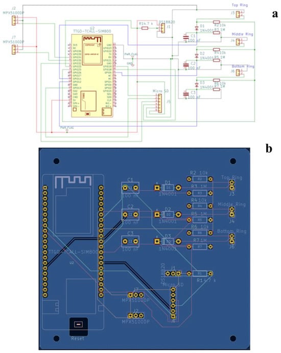 (a) Electric circuit diagram of the prototype and (b) printed circuit board (PCB) generated by Kicad software (version 7.0).