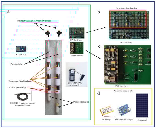 Multiparameter sensor hardware: (a) main components, (b) detail of the DIY board, (c) details of the printed circuit board (PCB), and (d) additional material.