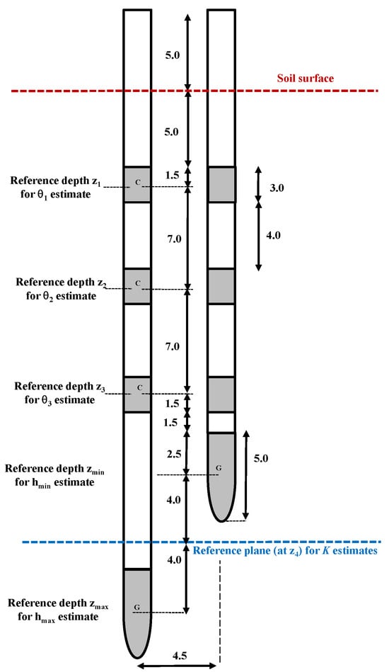 The IPM (also known as the internal drainage method) [41] is a widely recognized technique for in situ determination of the K(θ) function of subsurface layers during unsteady or transient processes [1]. This method relies on simultaneous measurements over time of volumetric water content and the soil water matric potentials at different depths along the soil profile. The procedure involves the installation of various probes, such as time domain reflectometry (TDR) or capacitive probes and tensiometers, to measure the hydraulic properties of the investigated medium. The soil is wetted to achieve saturation, and then the K(θ) curves are determined during either a drainage or evaporation process [42,43,44,45]. The obtained information is crucial in addressing environmental and agricultural challenges, particularly for estimating water drainage below the root zone and determining the soil water balance [46].