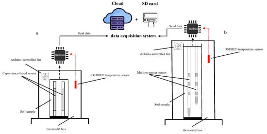 For both experiments, the soil samples were preliminarily oven dried at 105 °C and then sieved at 2 mm. Figure 6 shows a schematic representation of the measurement system used in the laboratory experiments.