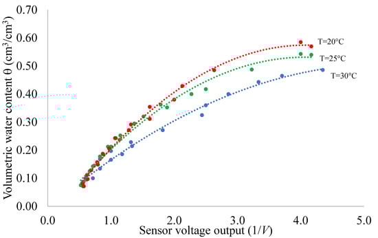 The accuracy of capacitive-based sensors is influenced, amongst other things, by temperature fluctuations. The outcomes of experiment #1, illustrated in Figure 7, show this dependence with reference to the proposed monitoring system. The measured θ values are plotted against 1/V for the three chosen temperatures. For a fixed temperature, the dashed lines represent the regression functions selected to estimate the correlation between the sensor output and volumetric water content. It is worth noting that, for a fixed sensor voltage value, as soil temperature increases, the θ values decrease. Observable differences in θ values become less evident as the soil becomes dry, since the dielectric response of the sensor is more dependent on soil permittivity.