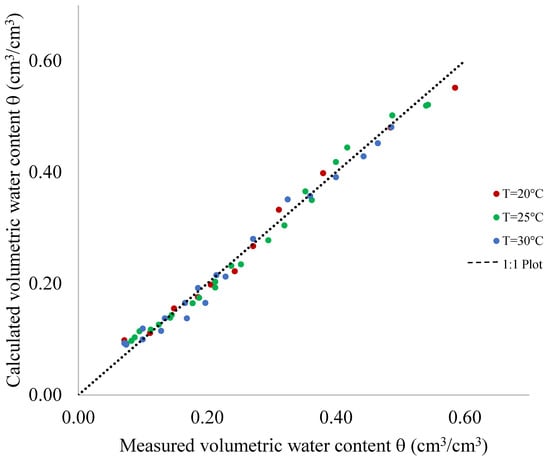 In Figure 8, the θ values derived from regression functions are compared with the known θ values from an independently acquired dataset dedicated to model validation. The obtained values closely align with the 1:1 line, indicating the capacitive sensor’s accurate performance in θ estimation from saturation to dry soil conditions. The sensor’s accuracy is practically the same from saturation to dry soil conditions and among different temperatures.