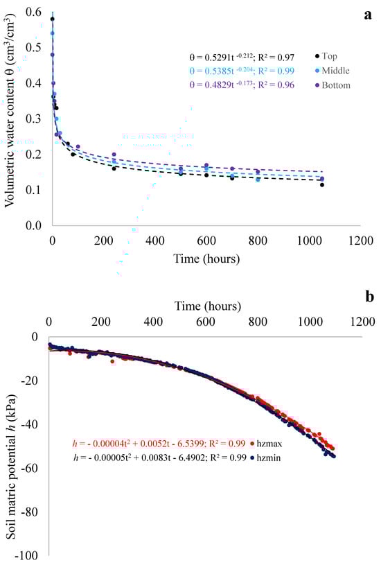 Figure 9b displays the measured soil matric potentials as a function of time. Experimental h data were fitted, at the selected depths zmin and zmax, using a second-order polynomial function with R2 equal to 0.99 for both investigated depths.
