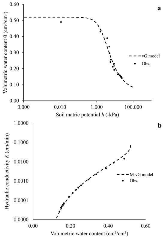 (a) Experimental soil retention curve and modelled by van Genuchten (vG) equation and (b) experimental soil hydraulic conductivity function and modelled by Mualem–van Genuchten (M-vG) formula at the reference plane z4.