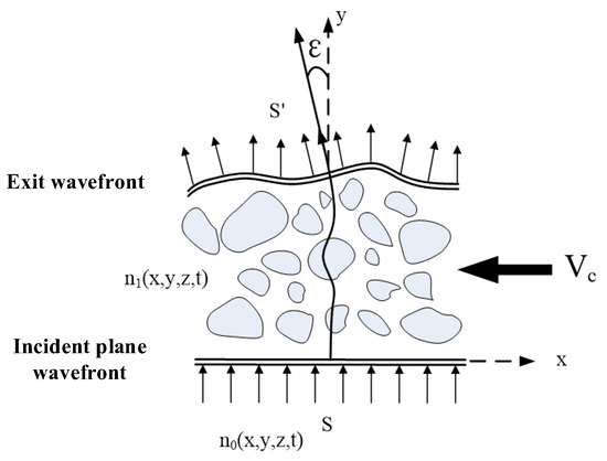 Background-Oriented Schlieren (BOS) imaging utilizes the perturbation of light waves by airflow and exploits the relationship between gas refraction and flow field density gradients to perform optical non-contact flow detection. It captures imaging of non-uniform refraction phenomena in transparent media that are typically invisible to the naked eye. When a beam of light passes through a turbulent flow field, if the flow field is disturbed in some way, the light rays deviate from their original propagation direction compared to when the flow field is undisturbed. Figure 1 illustrates the wavefront distortion produced by turbulent flow fields as a plane wave passes through, where the refractive index is denoted as n0(x,y,z) for the incident plane wave S. After passing through the turbulent flow field with velocity Vc and refractive index n(x,y,z), various vortices in the flow field cause deflection of the light rays. Consequently, the light ray path changes to S′, not only shifting in position but also altering its direction ε at the distorted wavefront position [11,12].