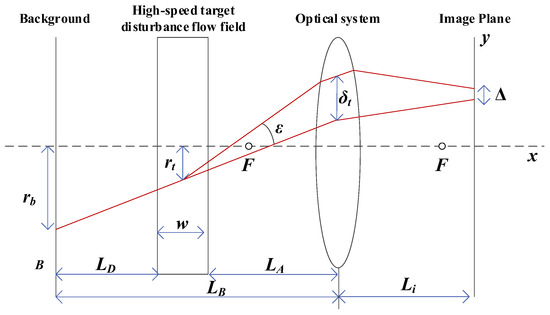 According to the above figure, for the detection camera, its sensitivity is unrelated to the deflection angle of the light rays. The angle only represents the disturbance characteristics of high-speed target schlieren. The magnitude of the image point displacement is only related to the imaging system’s focal length f, the distance between the flow field and the background LD, and the distance between the detection system and the background LB, independently of other factors. In other words, the sensitivity is only related to the imaging system’s focal length f, the distance LD between the flow field and the background, and the distance LB between the detection system and the background.