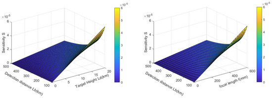 According to the sensitivity model formula, the sensitivity is related to the detection distance, target height, and system’s focal length, as shown in the Figure 4.
