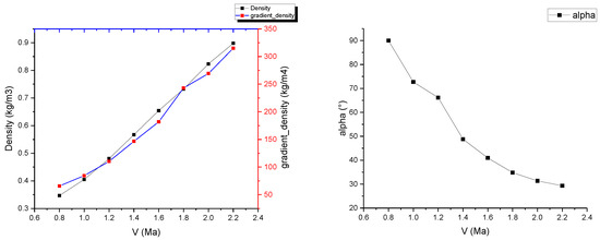 The statistical analysis of the results shows the variation in the maximum density of the target and the maximum density gradient with flight speed, as depicted in the left figure of Figure 6. The relationship between the shockwave angle α, formed during high-speed flight, and the flight speed is illustrated in the right figure of Figure 6. It can be observed from the figures that as the flight speed increases, the shockwave shape becomes sharper, the flow field gradient becomes stronger, and the image signal-to-noise ratio of the detection system increases. If it is necessary to detect shockwave phenomena of a certain scale, the flight speed should be at least 1.0 Mach.