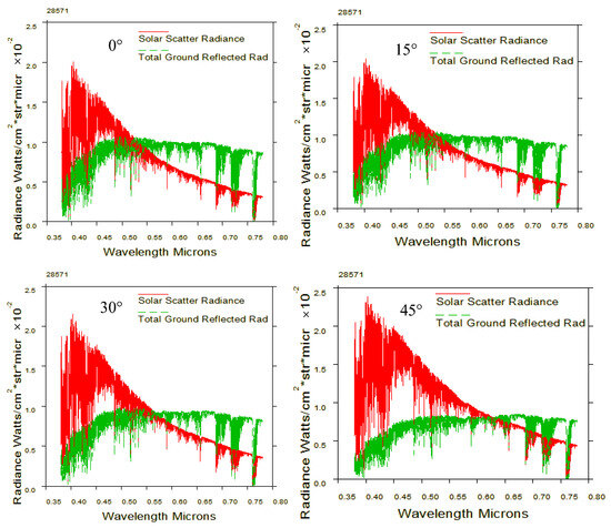 Comparison of ground reflectance and atmospheric scattering radiance at downward viewing angles of 0°, 15°, 30°, and 45°.
