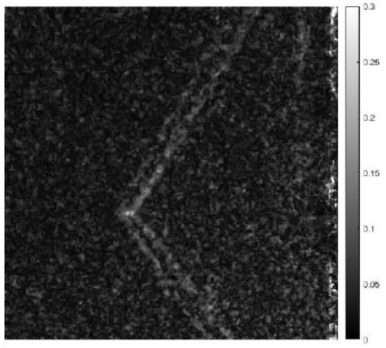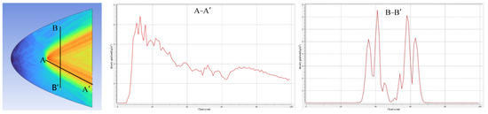 Considering the size of the detectable disturbance area, when the BOS detection system detects a winged target, simulations are conducted with a flight height of 10 km and an analytical speed of 1.6 Ma. The disturbance area generated by the winged target is shown in the Figure 11. A-A′ and B-B′ show the interference direction and longitudinal slices. From the figure, it can be observed that the disturbance area generated by the winged target contains multiple linear features. Each linear feature disturbance area gradually decreases linearly in the disturbance direction, reaching approximately one-fourth of the original intensity at a distance of about 20 times the target’s body size.