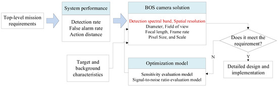Designing the detection process of high-speed targets using the background shadow imaging system is illustrated in Figure 12. Generally, the overall performance indicators of the system need to be determined based on the detection task requirements. Then, the performance indicators are decomposed, and the spectral range and spatial resolution of the detection process are designed according to the specific scenario. Since the spatial resolution directly determines the sensitivity and accuracy of the final detected target shadow, it is a key indicator that requires special attention. Subsequently, based on the spatial resolution and device capabilities, other indicators such as the aperture and detector are determined. Once the overall performance indicators are designed, detailed design indicators and schemes can be developed for each subsystem of the BOS detection camera.