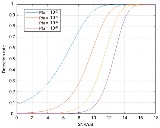 In this study, considering general mission requirements, a detection probability of 90%, a false alarm rate of 10−4, and an operational distance of 400 km are proposed as the system performance indicators. According to signal detection theory [22,23], the relationship between the detection rate, false alarm rate, and SNR under binary detection is represented by the following equation, where Q is the Macsum Q function [24], Pd is the detection rate, Pfa is the false alarm rate, and SNR is the signal-to-noise ratio: