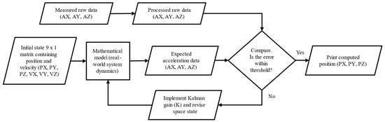 It is often difficult to obtain reliable displacements from an IMU sensor due to inherent noise and resulting sensor drift when double integrated. The primary engineering challenge is to suppress direct current (DC) drift and random walk effects. More information on these challenges are beyond the scope of the study and are presented elsewhere [21]. For the present work, a Kalman filter-based algorithm [22], accompanied by a mathematical model to efficiently estimate the position of the sensor in space (referred to hereafter as “algorithm”), was developed to overcome such issues using a series of scaling, filtering, and feedback reiteration to compute resilient displacements. A procedural overview of the algorithm is provided in Figure 2.