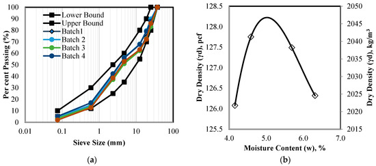 Crushed limestone aggregates conforming to INDOT No. 53 gradation were used in this study. Dry sieving was carried out on four representative batches to develop as-received particle size distribution curves per ASTM C136 [25] procedure. The results of the dry sieving are shown in Figure 4a. The material had an average particle size () of 0.16 in. (4 mm) with a top particle size of 1 in. (25 mm). The moisture–density characteristic curve, established as per the standard Proctor ASTM D698 [26] test procedure, is presented in Figure 4b. The material exhibited an optimum moisture content (OMC) of 5.1% and a maximum dry density of 128.2 pcf (2060 kg/m3). The control specimen was compacted to a bulk density of 133.4 pcf (2137.5 kg/m3) while the geogrid specimen was compacted to a bulk density of 134.1 pcf (2148.5 kg/m3), both at OMC.