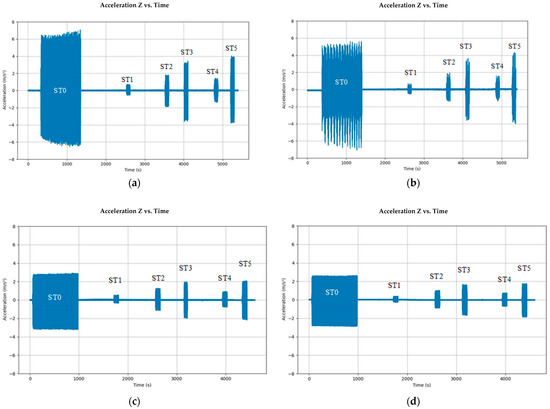 Processed vertical acceleration data from Smart Pebbles: (a)Top-CO, (b) Mid-CO, (c) Top-GG, and (d) Mid-GG sensors.