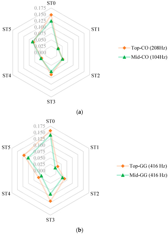 As evident from the acceleration magnitudes for both control and geogrid specimens, the acceleration measured by the sensor at the specimen’s mid-height is smaller compared to that observed at the top of the specimen. The same trend persists over all the stress states: ST0 (conditioning) through ST5. The highest acceleration trends were observed consistently for the conditioning stage. For the same stress ratio (deviator stress divided by confining pressure, i.e., ST0, ST1, and ST4), the deformation and in turn the acceleration always increase as the deviator stress increases. On the other hand, with the same confining pressure (i.e., ST1, 2, and 3; ST 4 and 5), the deformation and, in turn, the acceleration stay similar or increase as the deviator stress increases. The higher deviator stress and deformation will still lead to a stress-hardening behavior of unbound aggregates as demonstrated through resilient modulus trends observed for the ratio between the two.
