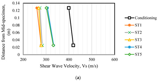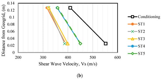 Shear wave velocity profiles for (a) control and (b) geogrid specimens.