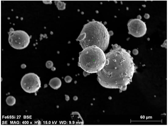 The Fe-6.5wt%Si powder for the PBF-L-based sample preparation process was manufactured by Changsa TIJO Metal Material Co., Ltd., (Changsha, China) using a gas atomization process. During the preparation phase, laser diffraction and scanning electron microscopy (SEM)–based measurements were performed to check and ensure the powder quality according to the GB/T 19077-2016 standards []. The resulting image of the SEM, with the particles’ shape and morphology, can be seen in Figure 1, which follows the desired spherical shape with a smooth and clean surface, besides the required chemical distribution, which is necessary for printing Fe-6.5wt%Si alloy.