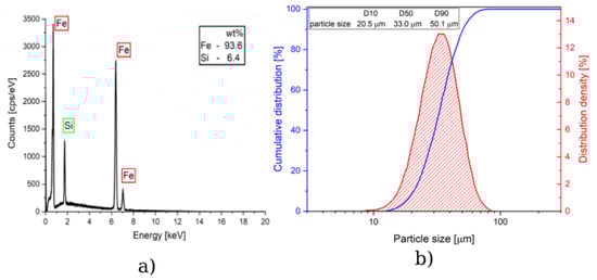 (a) Analysis of the chemical composition of the Fe-6.5wt%Si used by SEM–EDS, while the (b) part of the image shows the particle size distribution of the used Fe-6.5wt%Si powder by the laser diffraction method.