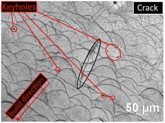Optical microscope image from a 3D-printed toroidal sample perpendicular to the printing plane at 20× optical magnification. The keyholes and a crack are marked in the image.