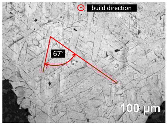 With the previously tested printing parameters, all samples were printed simultaneously without problems []. Optical microscopy was used to look for recurring phenomena of characteristic microstructural defects in several samples. A multifunctional Zeiss Axio Imager M1 microscope and AxioVision 4.8 evaluation software were used. X-ray diffraction was also performed using a Bruker D8 diffractometer to investigate the crystal structure of the laser-sintered samples. The mechanical and magnetic properties of additively manufactured parts are significantly degraded by cracks and porosities in the structure. Such defects do not comply with industry standards and hinder the widespread application of AM technologies. The keyhole pore is one of the most significant and common defects (Figure 4). Typical characteristics are that they occur at typical locations at the boundaries of the melt pool and have circular facies, as can be seen in Figure 4, where the marked keyholes are of the types described by S. Mohammad et al. []. In this image, the layers were built on top of each other from the upper-right corner to the lower left. Type I and type III are the result of depression zone fluctuation and gas expansion or vaporization. These types can be inferred from the near-circular pores at the bottom of the melt pool (type I) and at the boundary of the melting boundary (type III). Figure 4, marked in black, also clearly shows that the crack extends from porosity to porosity and is perpendicular to the direction of construction (). Cracks of this type are not formed due to inadequate fusion but typically caused by the relaxation of frozen internal stresses in this manner. Numerous studies have investigated the causes, locations, orientations, and prevention of porosity and crack formation []. In most cases, cracks parallel to the Z-axis (build direction) are caused by the combination of a high-temperature gradient perpendicular to the build direction and porosities (keyholes) that form between layers (somewhere in the melt pool). The temperature gradient is responsible for the internal stress, and the porosities act as stress concentration points where cracks can start or end—characteristic values of the examined hysteresis curve.
