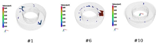 It can be seen from Table 1 that the difference between the measured volumes is negligible, less than 0.5%. The volume of the toroid sample is nearly the same at 145.5 mm3. The amounts of porosity and crack volumes in the material are not significant. Sample #6 has the highest porosity value, 0.5% of the material, while #10 has the fewest manufacturing defects; only 0.019 % of the total volume is intended. Ideally, the value of the porosity is less than 0.01%, while there is an inverse relationship between cumulative crack length and porosity. This phenomenon was first described by M. Garibaldi et al. for Fe-6.5wt%Si alloy []. It can be concluded that the porosity in the manufacturing samples was negligible, and the cumulative length of the cracks was insignificant, so a near-optimal laser sintering setup was used for the printing.