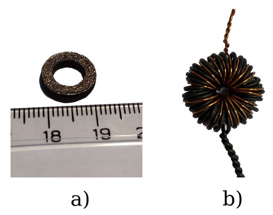 The main working principle of the applied system is depicted in Figure 3. During the measurements, two coils were wound around the printed samples, where the primary coil consists of 30 turns (), while the secondary has only 20 turns () due to the small size of the toroidal sample; it was not possible to increase the number of turns if we wanted to use a copper wire that can withstand relatively high currents with adequate cross section.