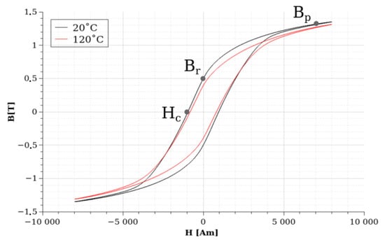 A 120 °C curve is shown in Figure 9 to show how the measured static hysteresis curves change during the function of the temperature. We have marked some characteristic points in the figure and on the reported hysteresis curve to characterize the effect of increasing temperature by changing these points. These points are the following: the coercive force (), marked by the intersection of the hysteresis curve and the axis; the remanent magnetic field (), marked by the intersection of the hysteresis curve and the axis; and , which is the magnetic flux density value at 7000 A/m magnetization force.