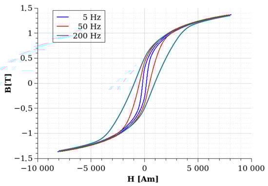 Frequency dependence of the examined FeSi materials’ magnetic hysteresis curve. The sample was measured at three different frequencies: 5 Hz, 50 Hz, and 200 Hz.