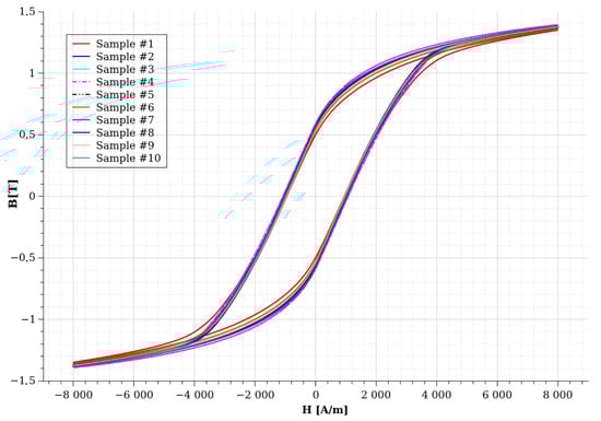 Based on previous experience and calculations, the accuracy of the hysteresis measuring device is around 0.5%. In the first measurement, we wanted to check how the accuracy of the measurement evolves for the three characteristic values mentioned above. For this purpose, measurements on sample #1 were repeated ten times to filter out the unnecessary peaks caused by a switch-on. The measurement results are in Table 2. The measured data show that is the most sensitive to the measurements, with a relative value of about 1%, while is the most stable of the three selected characteristics, with a sensitivity of less than 0.2%. These numbers characterize the sensitivity of our measurements, all of the changes in the hysteresis curve parameters that are higher than the numbers mentioned above caused by the thermal and frequency dependency of the examined samples.
