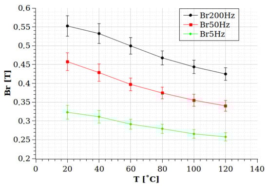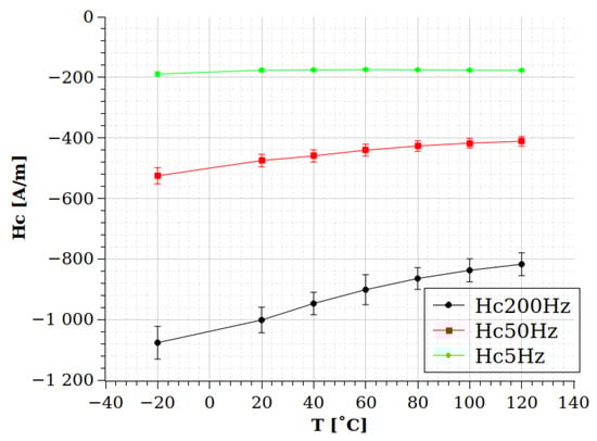 Figure 10 shows the hysteresis curves at 20 °C at the different measured frequencies, 5 Hz, 50 Hz, and 200 Hz. It can be seen from the image that, in agreement with the expectations, the area of the hysteresis loop is increasing due to the increased frequency.