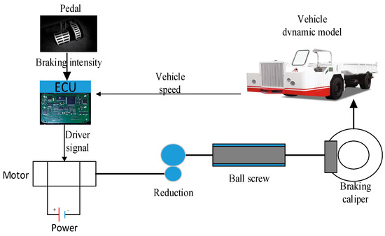 In the immediate future, coal resources must continue to account for the majority of energy consumption in China and continue to be widely used all over the world [1]. Underground electric trackless rubber-tired vehicles (UETRVs) are efficient and green auxiliary vehicles in underground coal mine production, completing the task of transporting persons or materials between the surface and underground efficiently and automatically. However, the existing braking systems of mine UETRVs generally use a hydraulic disk braking structure [2]. Although traditional hydraulic braking (THB) systems are currently widely applied, novel brake-by-wire (BBW) systems have obvious advantages such as a simple structure, a faster response under a lower temperature, fewer components and no hydraulic pipes, and a lower potential pollution risk of oil leakages [3]. In addition, the existing electro-hydraulic braking (EHB) applied in the automotive industry is based on electro-boosters, whose power is generated by the engine, meaning that that it is impossible to integrate this type of system into an intelligent chassis control system of novel mine unmanned electric vehicles. Last but not least, high-level automated driving for UETRVs requires a fully decoupled BBW system which can provide more accurate motion control performance during the autonomous braking process. Therefore, it is highly necessary to consider adopting a novel BBW system and a relevant control method in order to deal with the above problems [3,4].