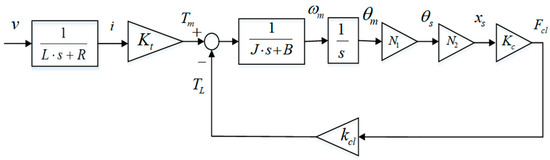 Based on the above contents, a mathematical model of an EMB actuator for a target UETRV is described in Figure 2. The relationship between the current and voltage is simplified as a one-order transfer function with parameter and . The ball screw angle and its displacement have a proportional relationship expressed as . , where is the lead of the ball screw. In this model, mapping the relationship curve between and is considered as a cubic polynomial, as shown in Equation (10).