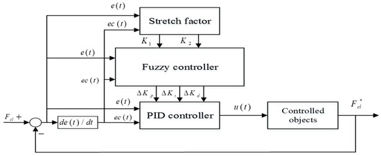 In this section, a cascaded control architecture with three close-loop PID control units is described in detail. Especially, the clamping force is tracked reliably via adopting a Variable Universe Fuzzy (VUF)–PID algorithm, which can adaptively adjust gain parameters of , , of the clamping force loop and reduce adjustment time compared with only the PID control. The contact point detection technology based on the experimental method is also illustrated in this section.