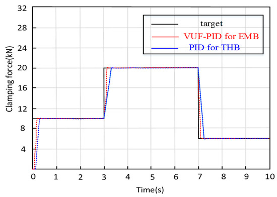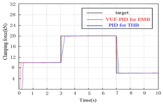 Clamping force–step response curves comparison between EMB with VUF-PID and THB with classic single-close-loop PID.