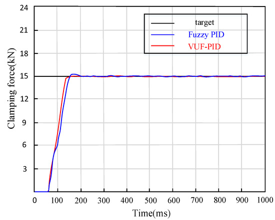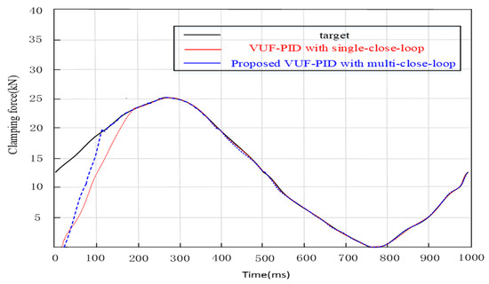 In Figure 10, the establishment times of a multi-close-loop VUF-PID controller and single-close-loop VUF-PID are 0.145 s (steady-state error: 0.21%), and 0.168 s (error: 0.28%), respectively. When the clamping force is increased from 10,000 N to 20,000 N, the clamping force adjustment times of the multi-close-loop VUF-PID and single-close-loop VUF-PID are 0.081 s (steady-state error: 0.18%), and 0.102 s (steady-state error: 0.24%). In the process of actual clamping force decreasing from 20,000 N to 6000 N, the adjustment times of multi-close-loop VUF-PID and single-close-loop VUF-PID are 0.066 s and 0.088 s, respectively. Both of them have smaller adjustment times compared with the stage of clamping force jumping. It also can be seen that the VUF-PID controller presents not only the smaller dead-zone time but also smaller adjustment time compared with the single-close-loop VUF-PID.