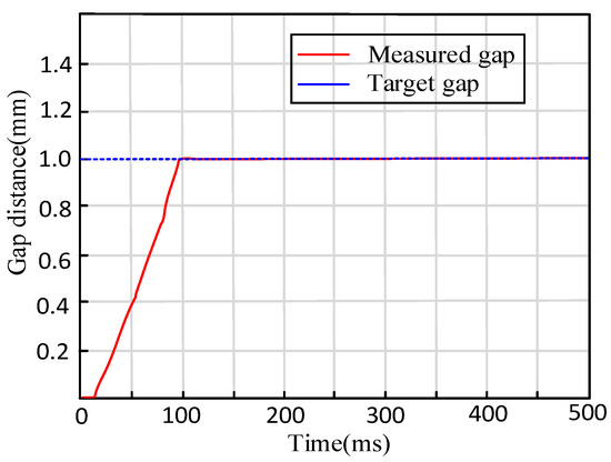 The experimental initial state is that the distance between friction pad and disk is zero mm. The target clearance is set to 1 ± 0.02 mm. When the test is started, the braking command value is sent into the local controller. The EMB with three-close-loop PID control can track the input reference clearance value within 95 ms and be kept stable.